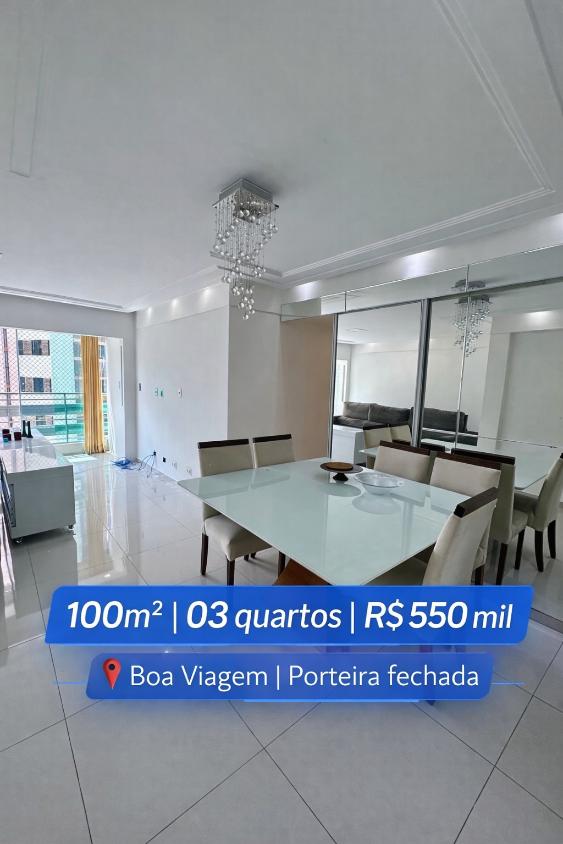 Descrição do Imóvel ?? Boa viagem ?? Venha morar no coração de Boa viagem. ?? Imóvel:? 100m²? ??: Norte? 03 quartos (01 suite) + DCE? Sala para 02 ambientes? WC Social ? Cozinha? Área de serviço ? 01 vaga  ?? Empreendimento:?? Salão de festas  Entre em em contato:?? 81) 9 99261122?? Direct R$ 550mil - Porteira fechadaR$ 500 mil - Móveis fixosCondomínio: R$ 699,00IPTU: R$ 160,00 Renda: R$ 17.500 - Entrada: R$ 110 mil - SAC  - Parcela: R$ 5.157,00